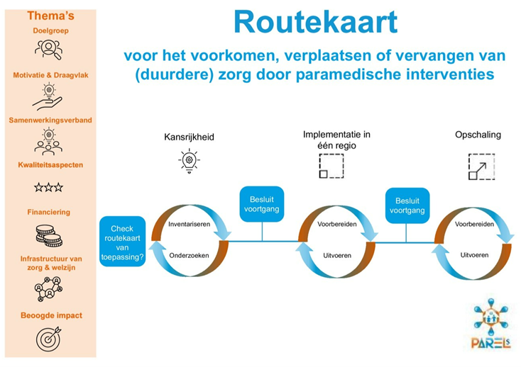 De routekaart helpt bij het doorlopen van het proces van starten en opschalen van paramedische interventies waarmee de kans op succes wordt vergroot. Het uitgangspunt hierbij is een interventie waarvoor wetenschappelijke aanwijzingen zijn voor het voorkomen, vervangen of verplaatsen van (duurdere of onnodige) zorg.